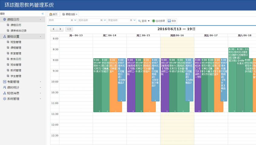 - 課程日歷: 自動排課、課程調(diào)整、多維度課程查詢